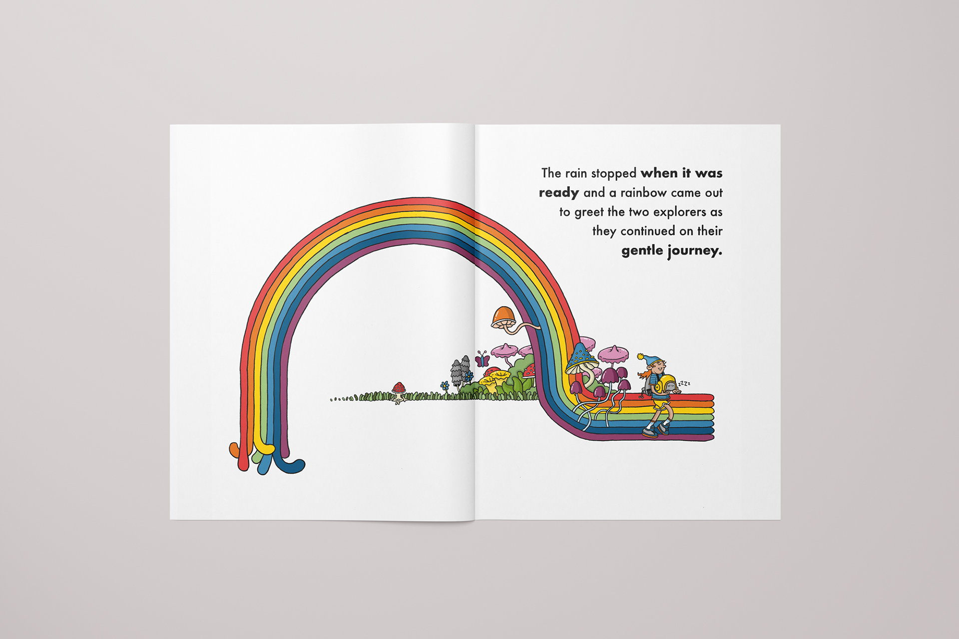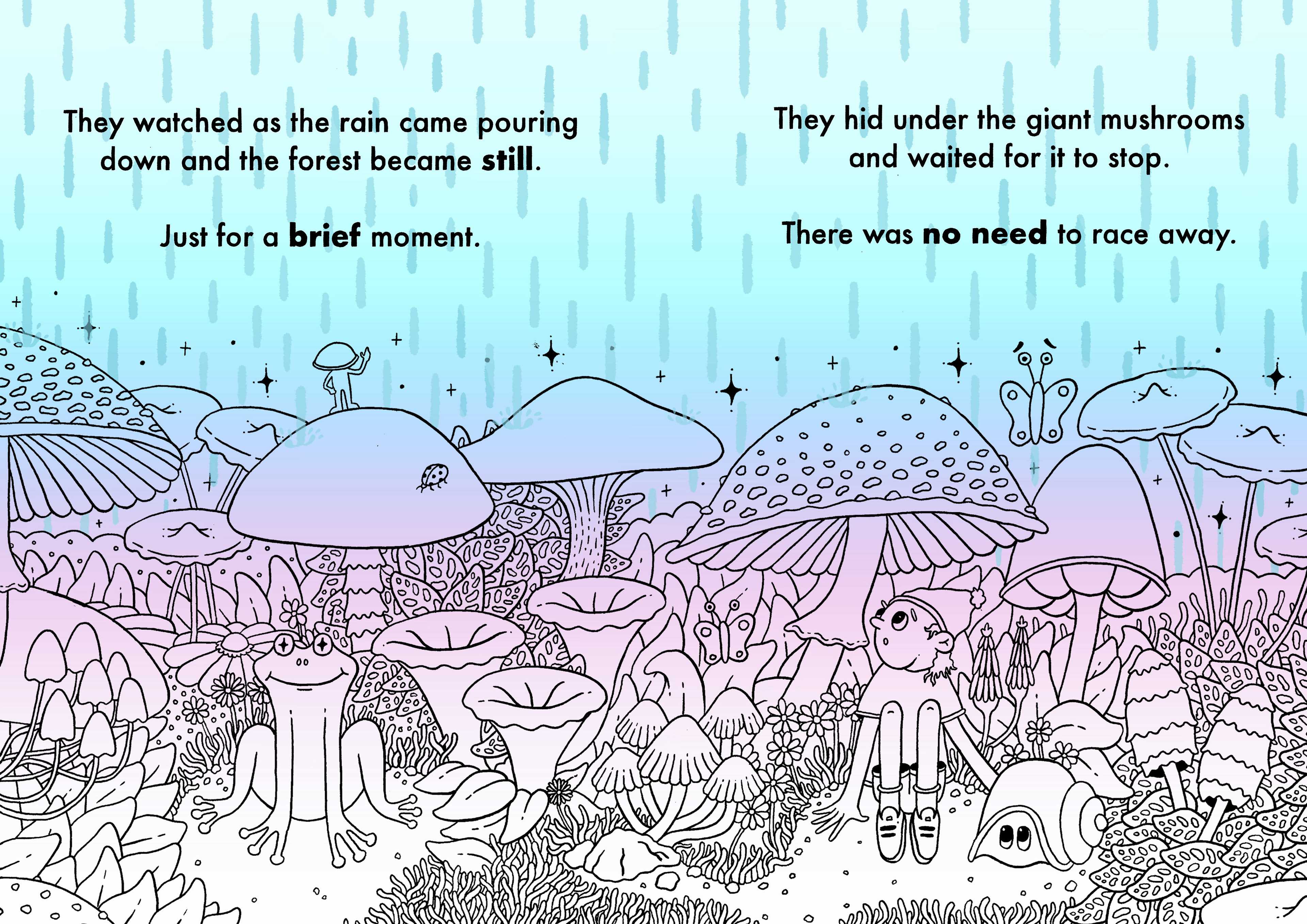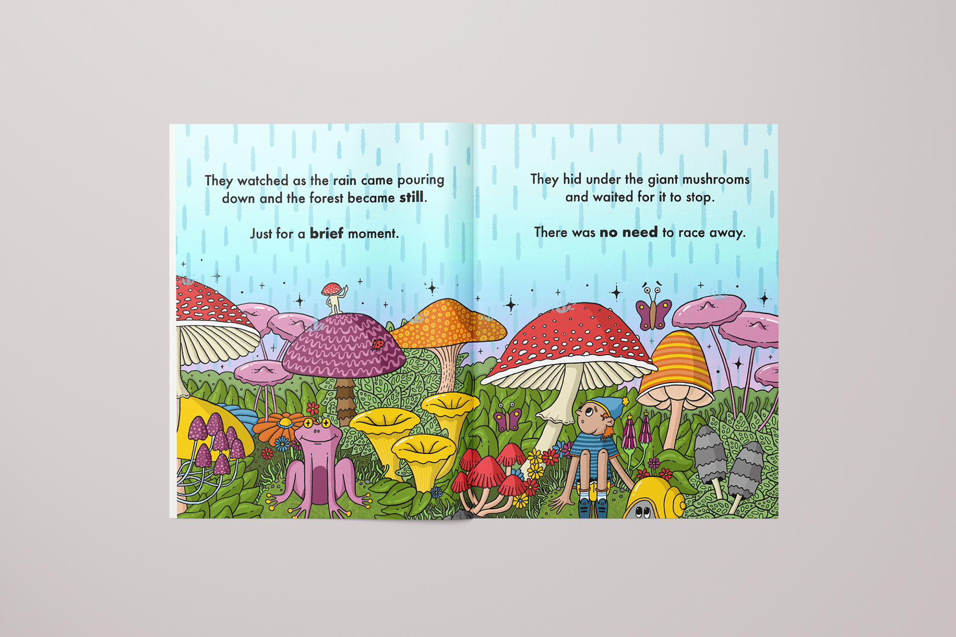 Each page is intricately illustrated to reward curiosity and discovery. Whether it’s the mischievous mushroom man dashing through the undergrowth or the secret thumbs-up plant peeking from behind a fern, there’s always something new to find each time the book is opened.