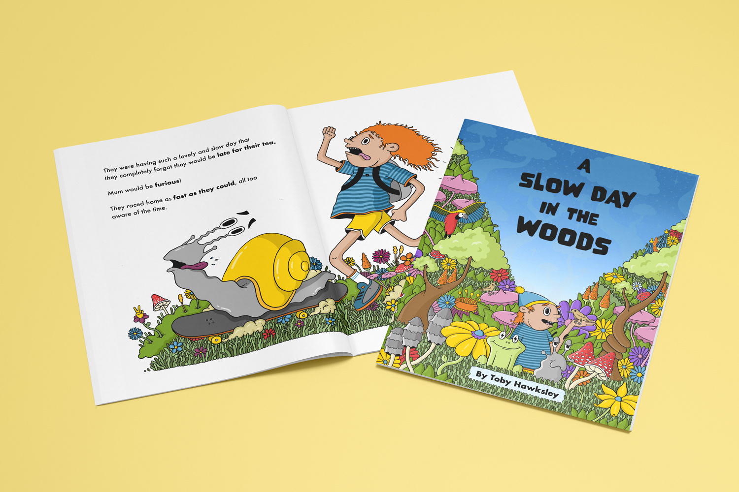“A Slow Day in the Woods” invites young readers to wander through a whimsical forest filled with playful creatures and hidden wonders. The book introduces basic mindfulness techniques through a calm, immersive visual journey — encouraging children (and parents) to slow down, observe, and find joy in the small details of nature.