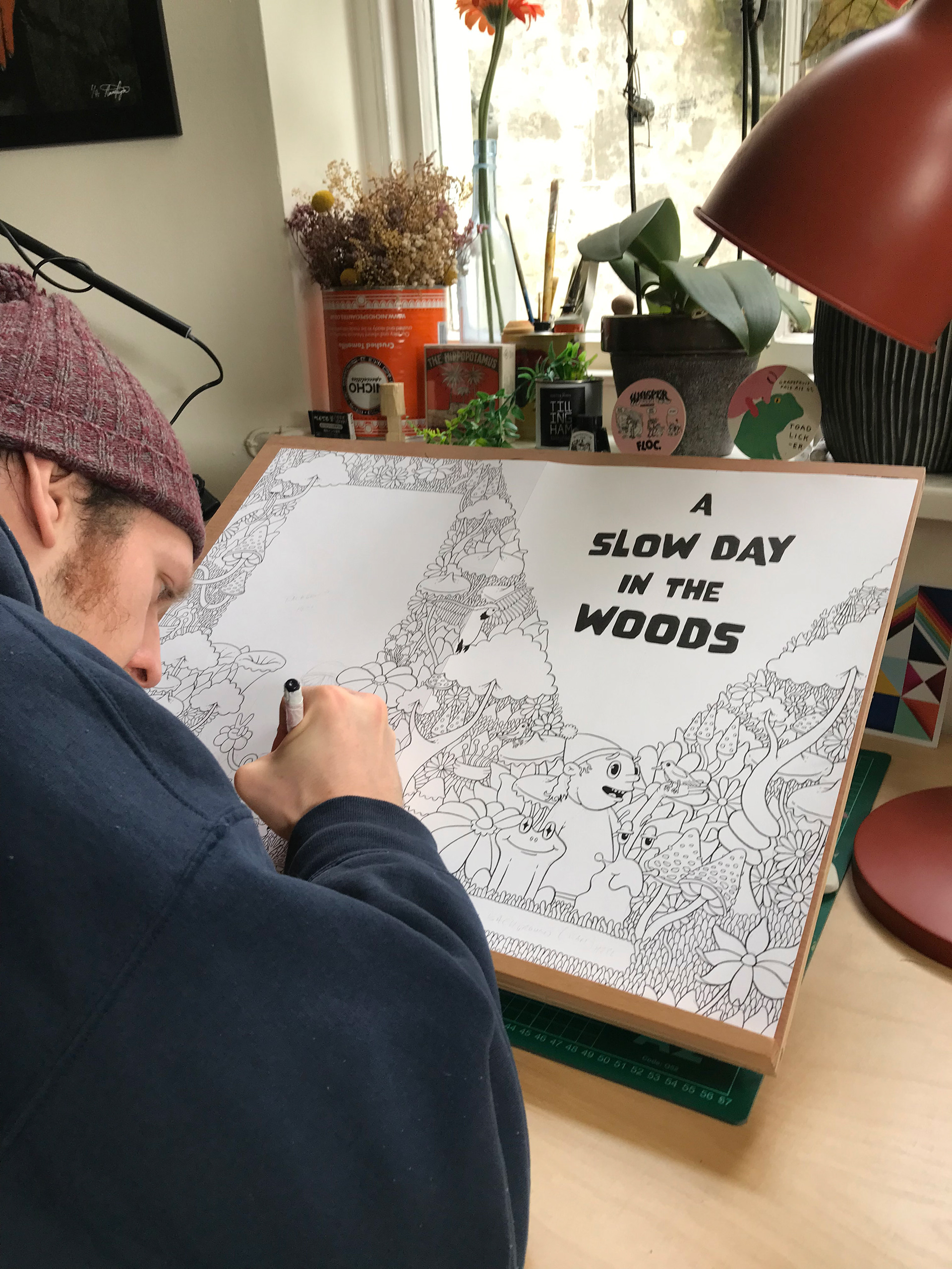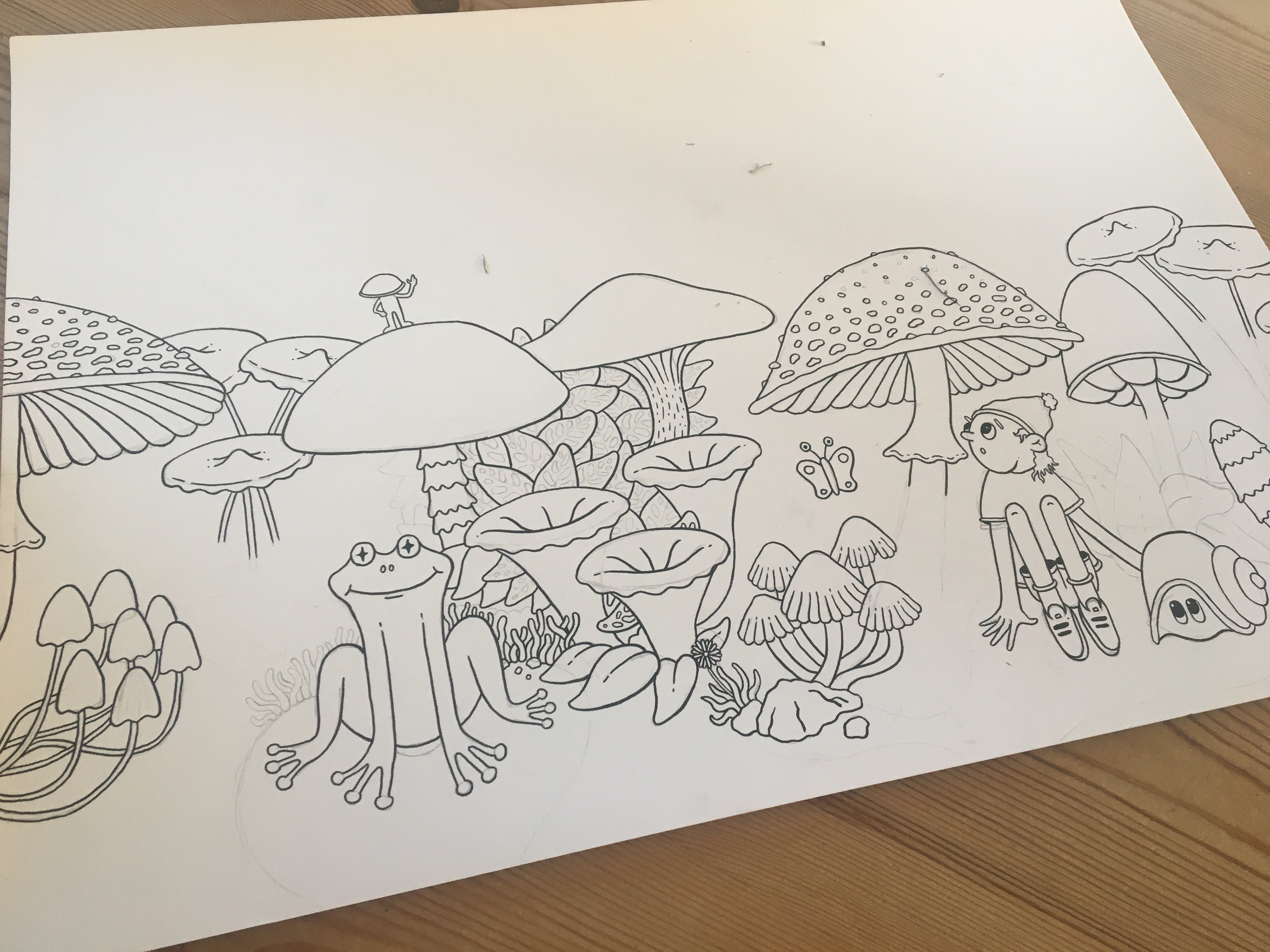 My illustration style focuses on playful characters and lush, detailed environments inspired by the natural world. Every scene begins as a pencil sketch, which I refine and ink using a brush pen to capture organic, expressive lines. Once the linework is scanned, I digitally colour and shade each illustration, layering warmth and texture to bring the illustration to life.